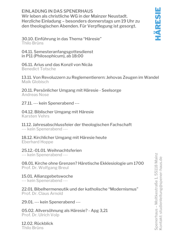 Im Seminarraum ist die Bibliothek mit ca. 4500 Büchern. Im Semester finden hier auch die wöchentlichen Spenerabende statt. Außerdem kann der Raum zum Arbeiten oder Freunde treffen verwendet werden. Hier findest du Infos zum Bewerbungsverfahren zum Download. Für Antragsdokument und Grundordnung des Spener-Hauses bitte auf das entsprechende Wort klicken.